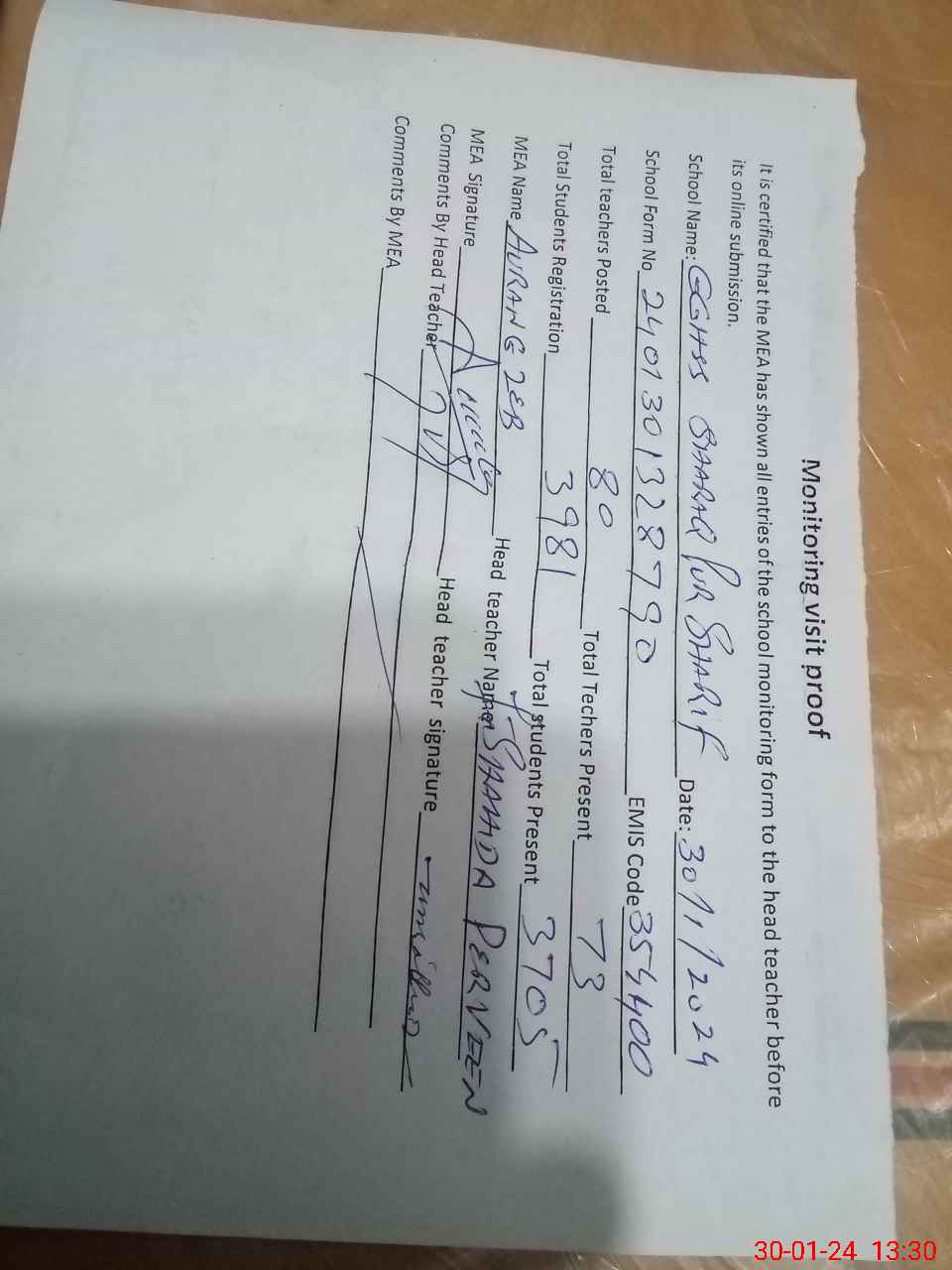 | Attendance Register | Head Teacher | MEA with School | Visit Proof |