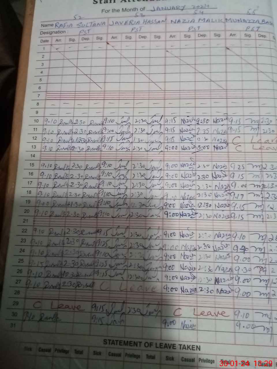 | CNIC | Full Name | Designation | R/C | Absence During Last Calender Month |