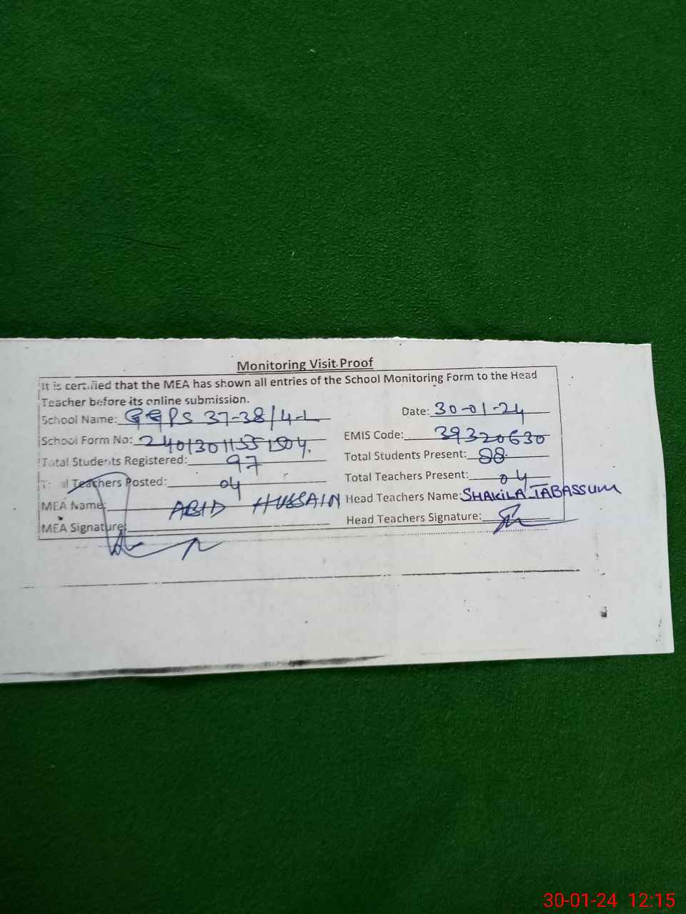 | Attendance Register | Head Teacher | MEA with School | Visit Proof |