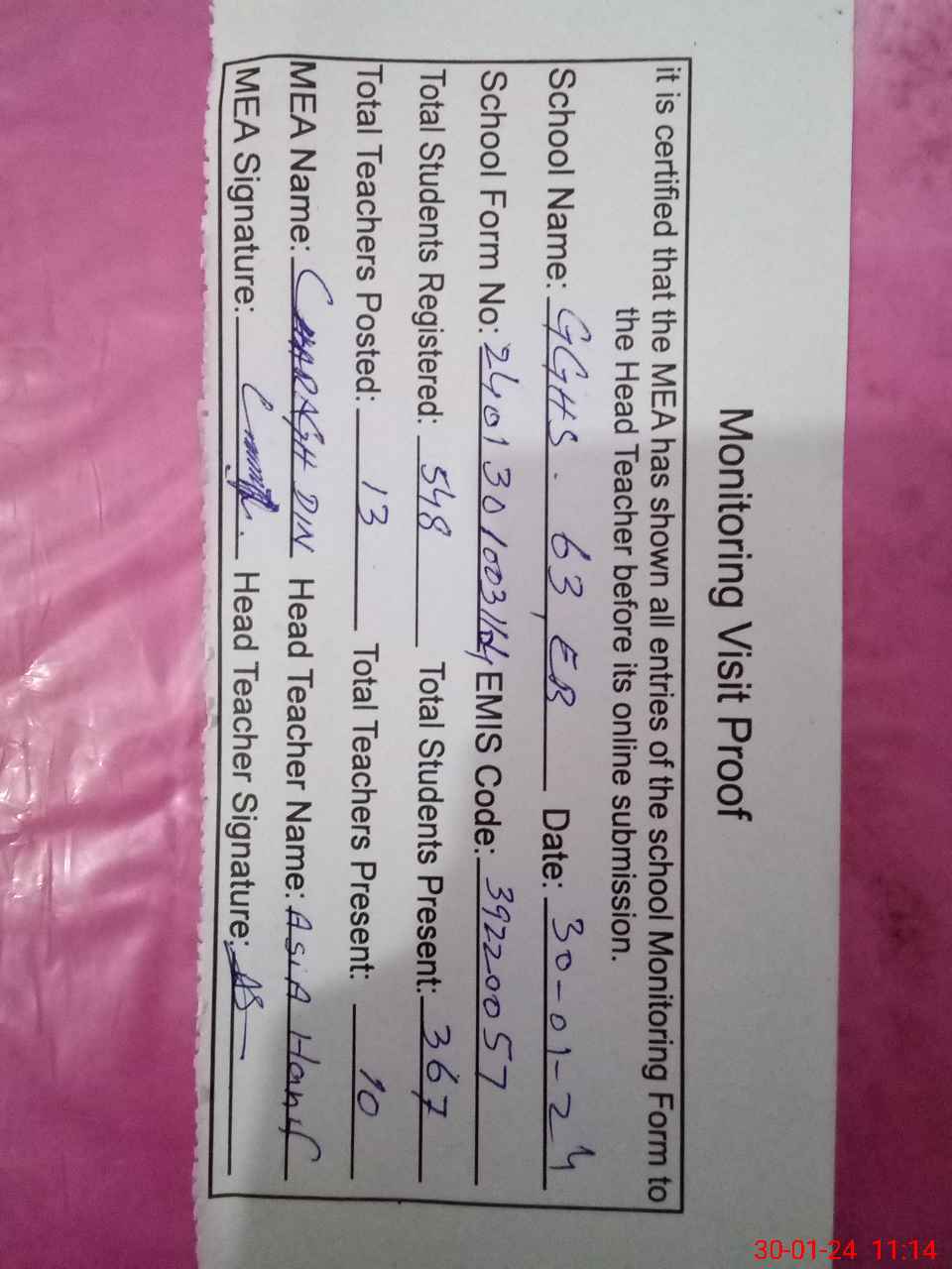 | Attendance Register | Head Teacher | MEA with School | Visit Proof |