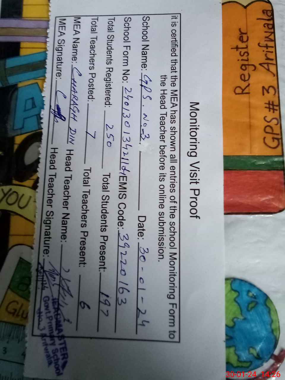 | EMIS Code: 39220163 | Name of School: GPS NO. 3 ARIFWALA | |||