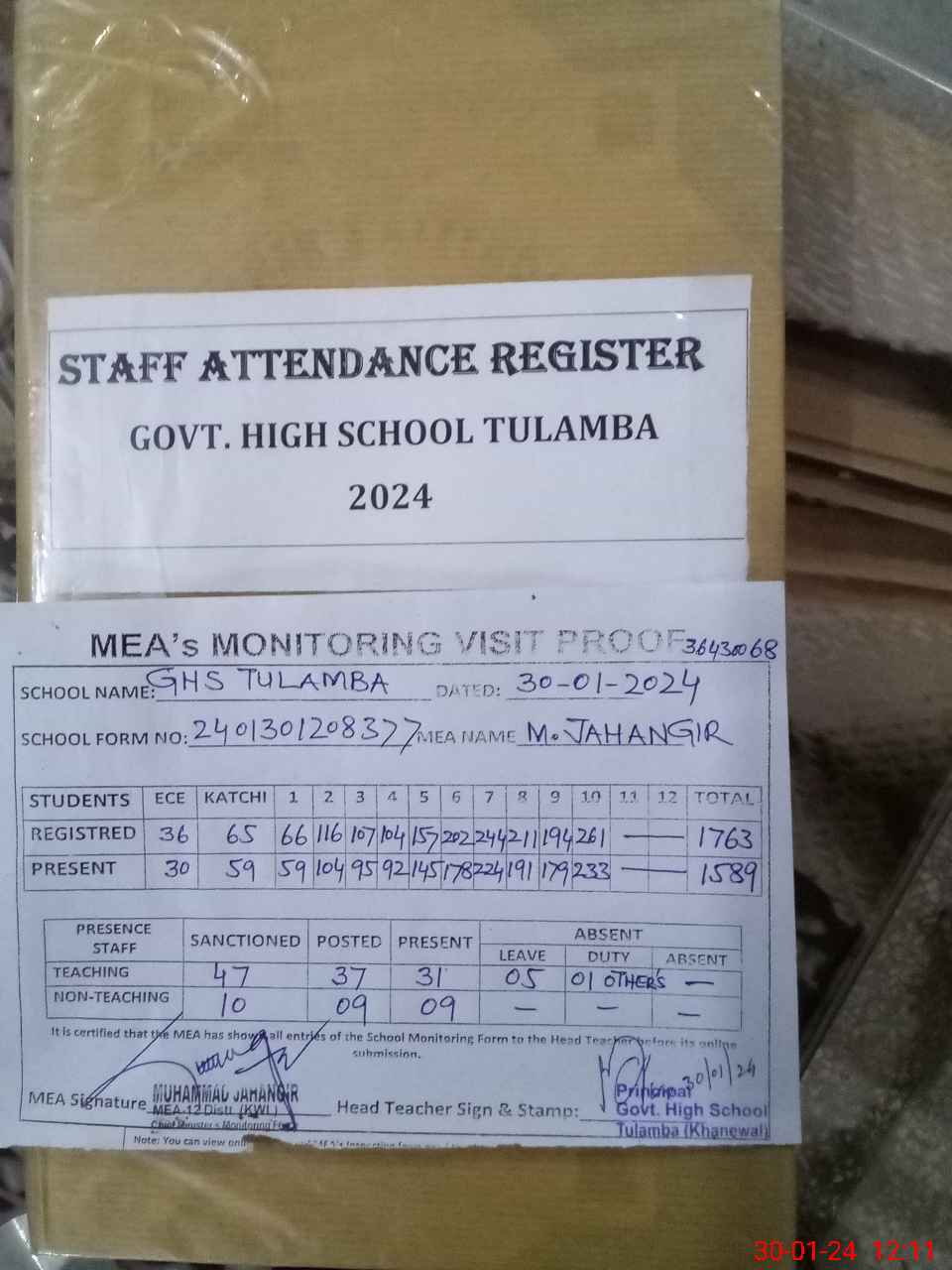 | Attendance Register | Head Teacher | MEA with School | Visit Proof |
