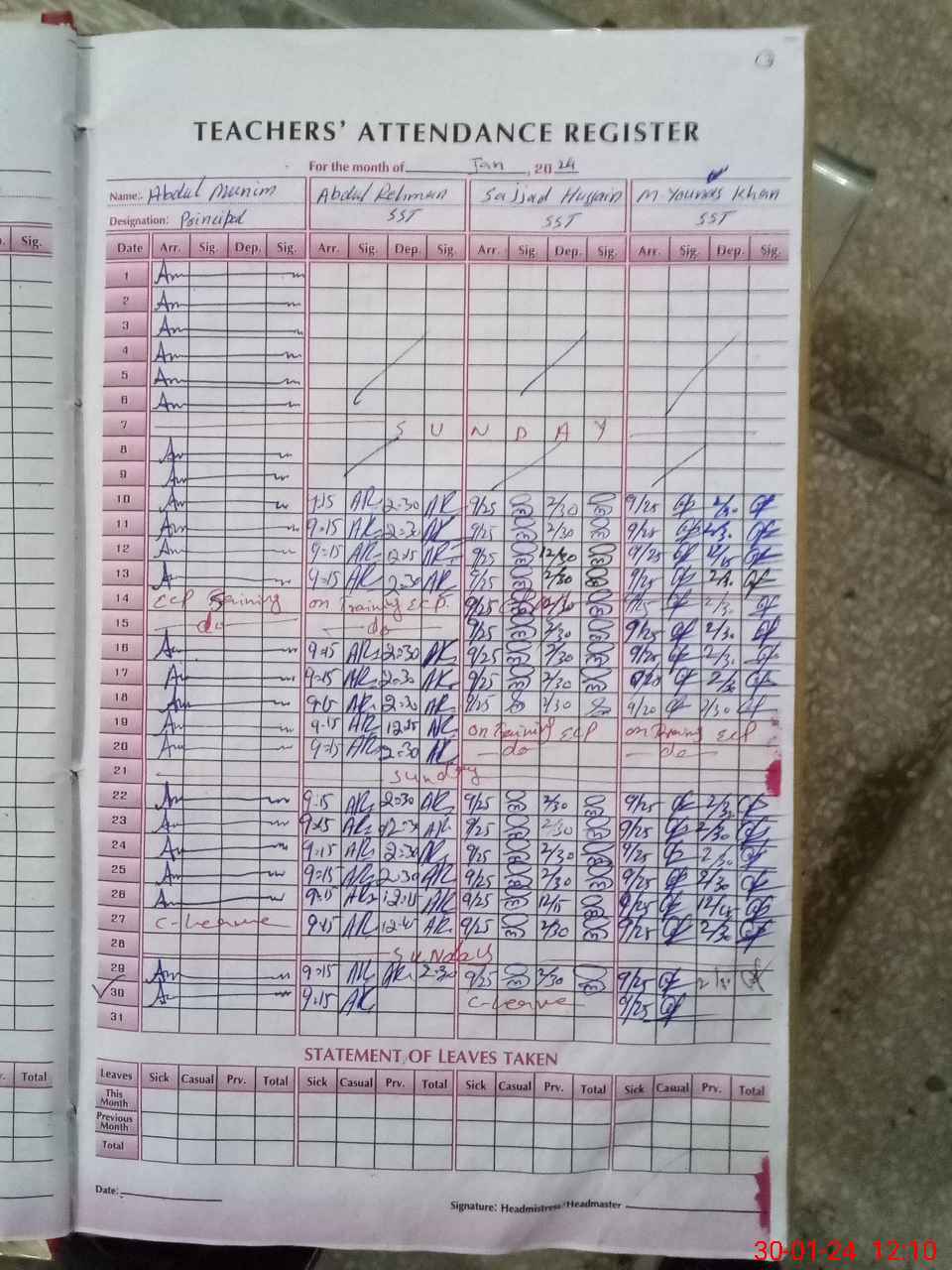 | CNIC | Full Name | Designation | R/C | Absence During Last Calender Month |