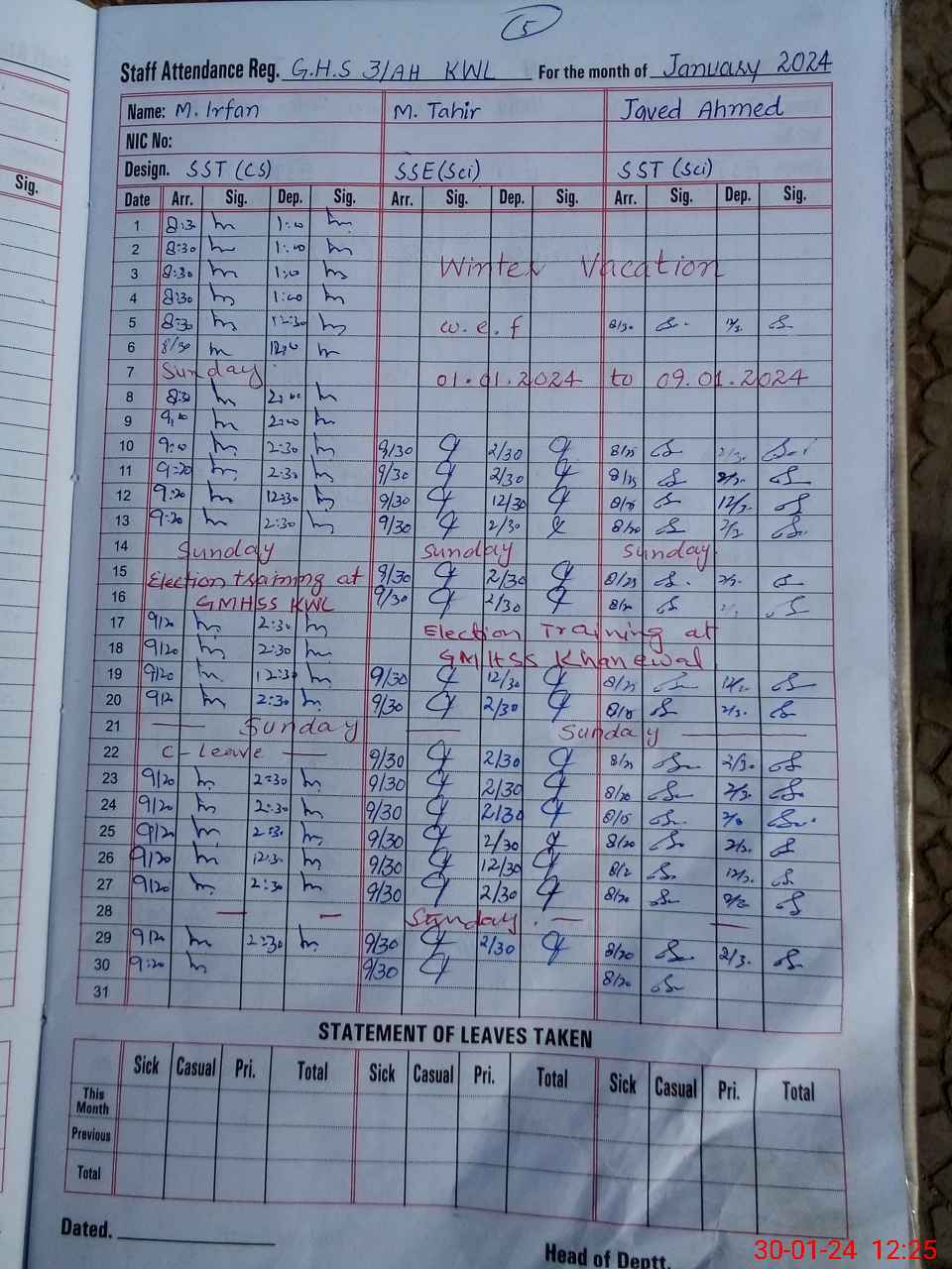 | CNIC | Full Name | Designation | R/C | Absence During Last Calender Month |