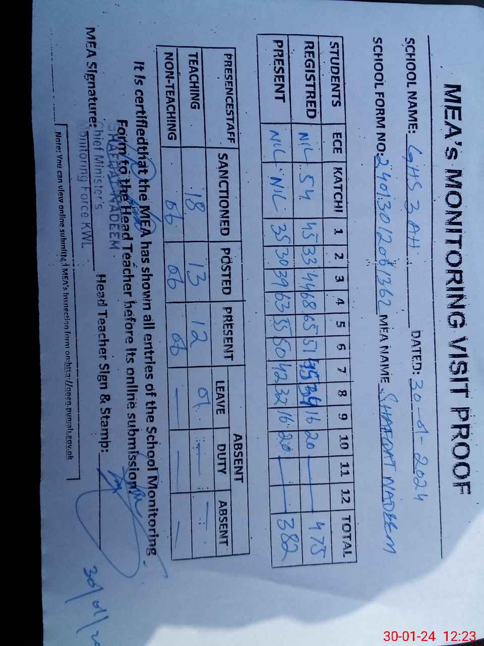 | Attendance Register | Head Teacher | MEA with School | Visit Proof |