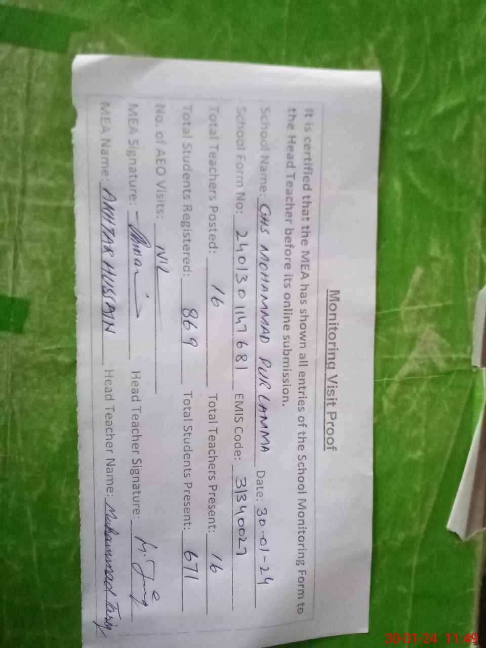 | Attendance Register | Head Teacher | MEA with School | Visit Proof |