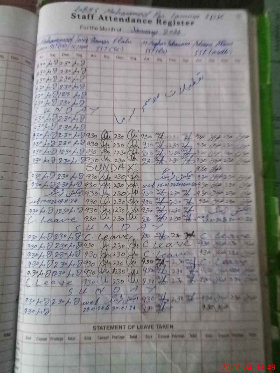 | CNIC | Full Name | Designation | R/C | Absence During Last Calender Month |