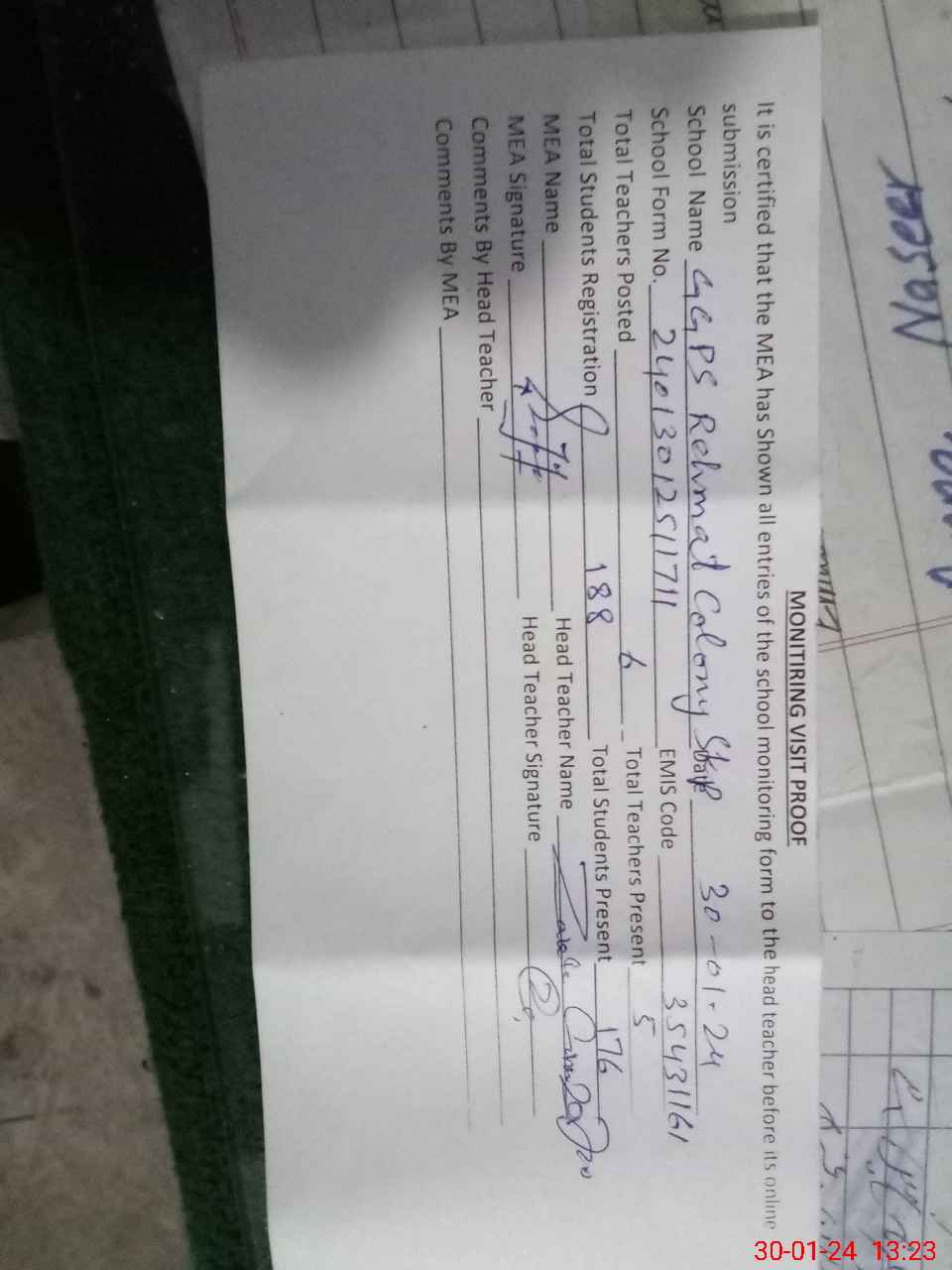 | Attendance Register | Head Teacher | MEA with School | Visit Proof |