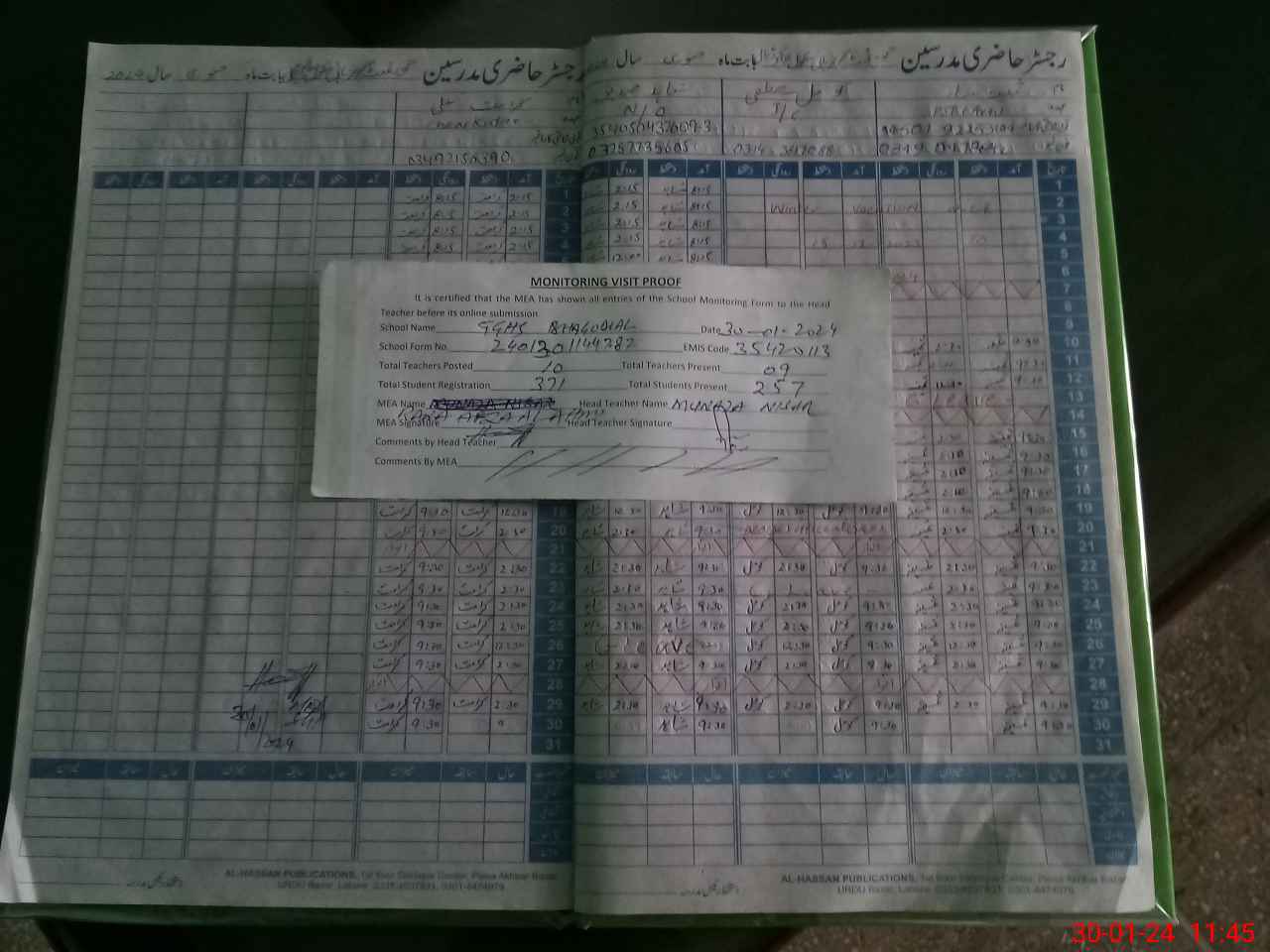 | Attendance Register | Head Teacher | MEA with School | Visit Proof |