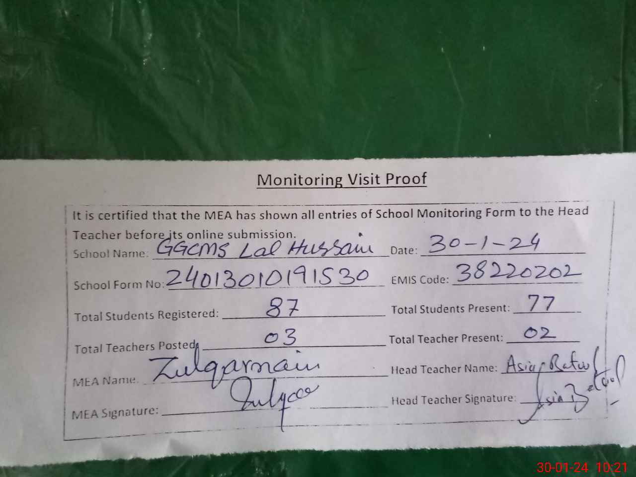 | Attendance Register | Head Teacher | MEA with School | Visit Proof |