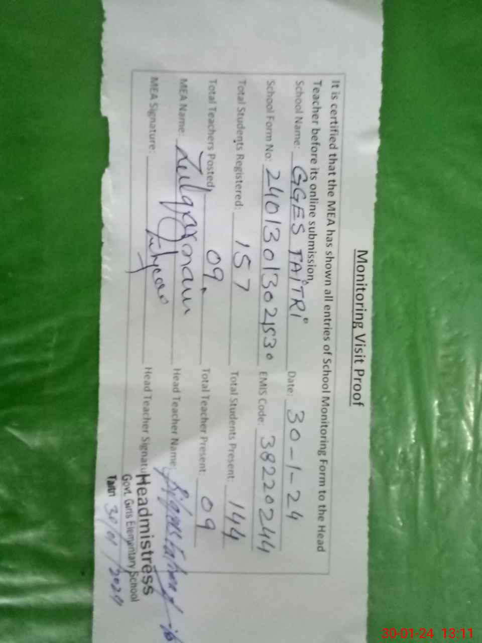 | Attendance Register | Head Teacher | MEA with School | Visit Proof |