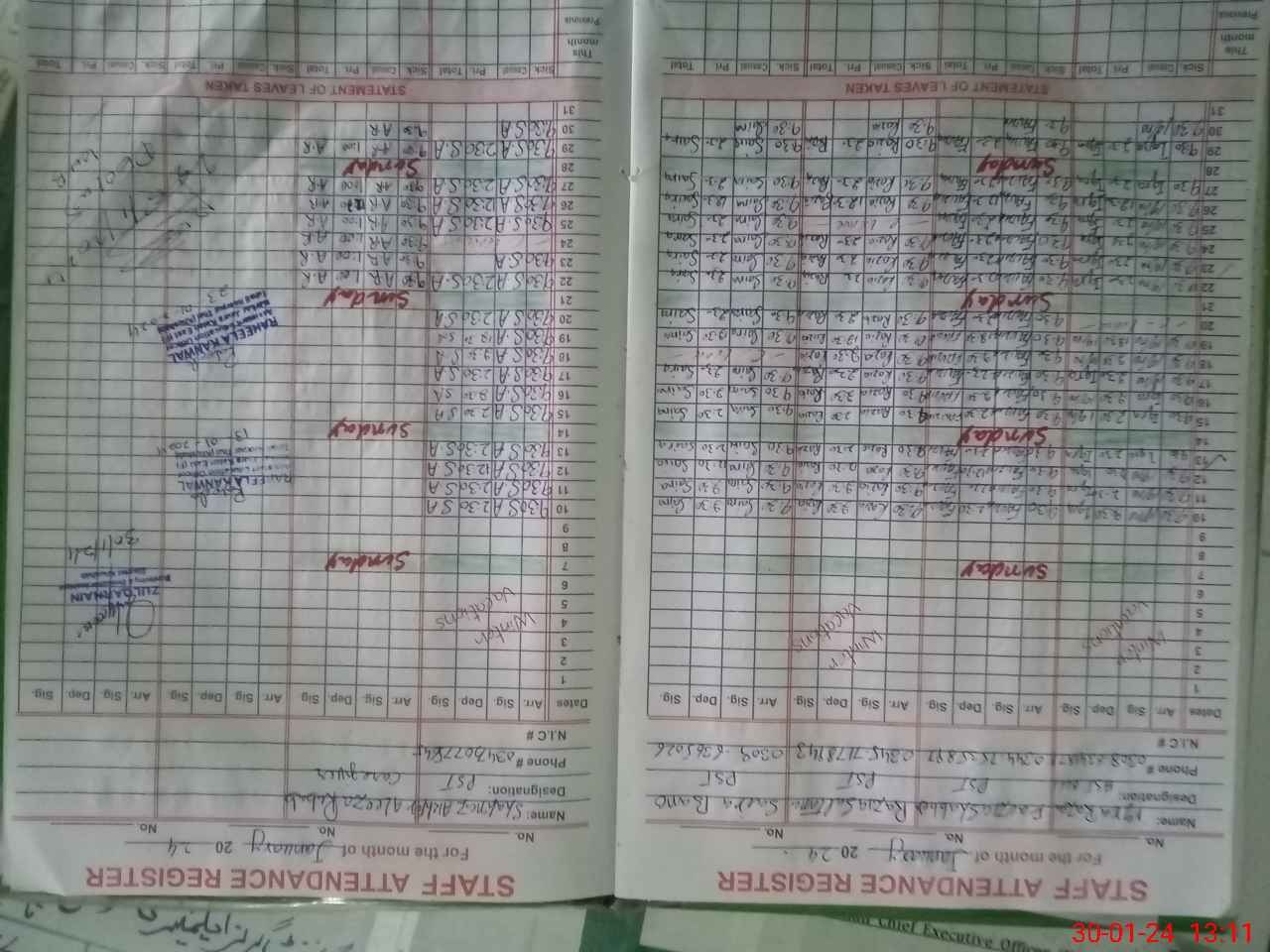 | CNIC | Full Name | Designation | R/C | Absence During Last Calender Month |