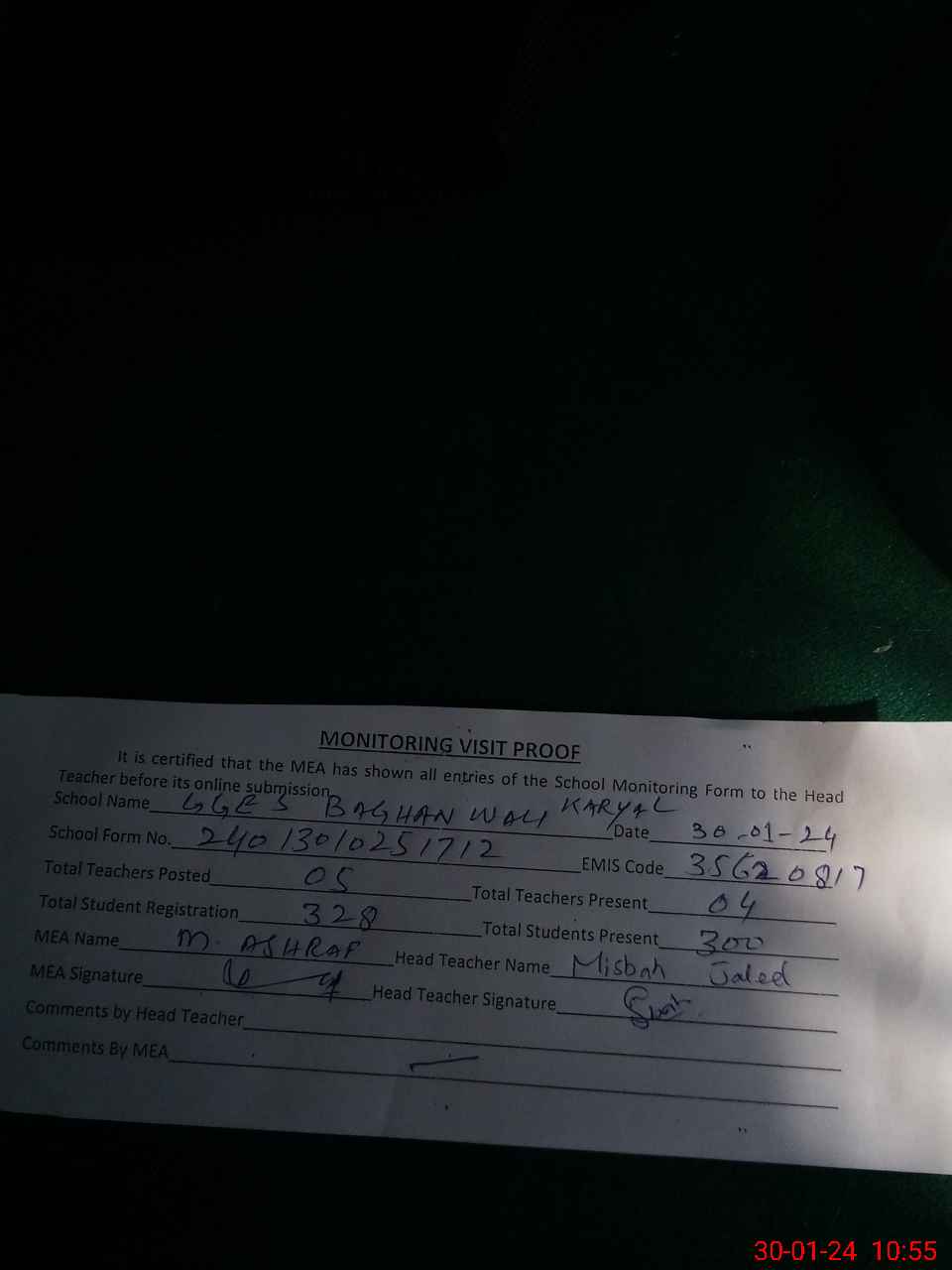 | Attendance Register | Head Teacher | MEA with School | Visit Proof |