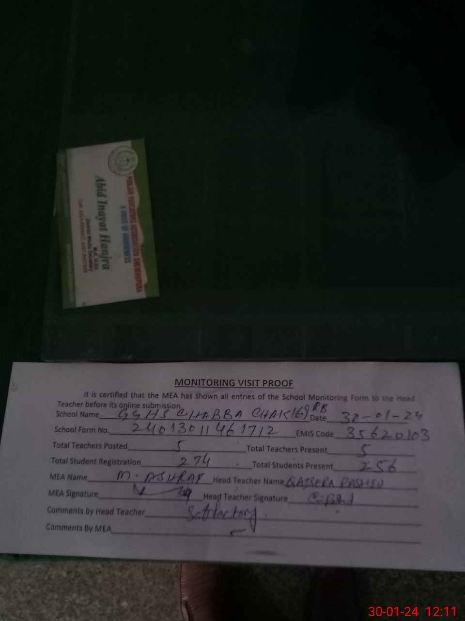 | Certified that this School was Inspected by the Undersigned MEA/DMO Today and the Information Stated Above is as Per Record. | |||||