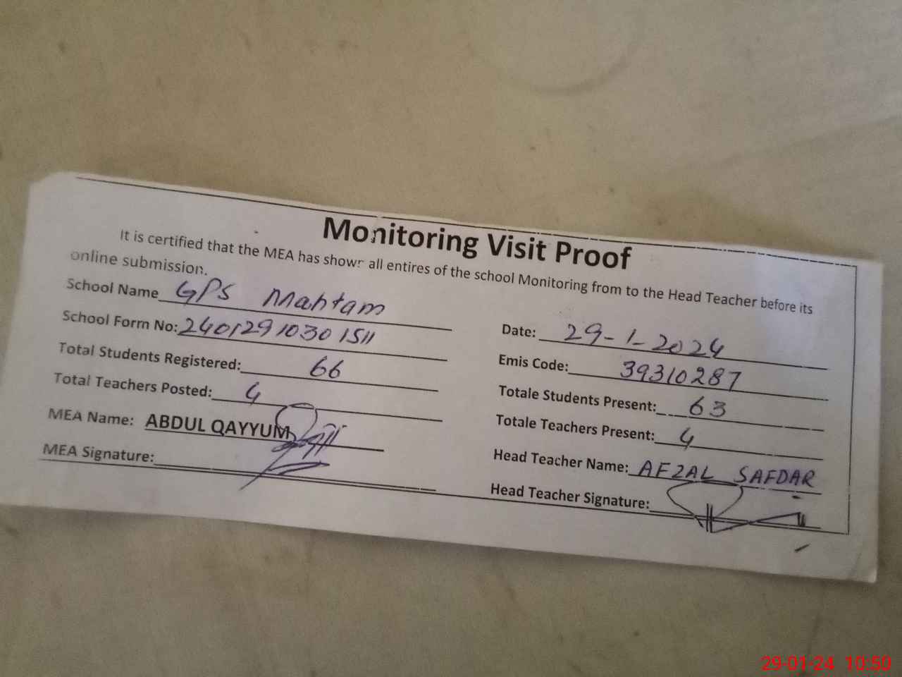 | EMIS Code: 39310287 | Name of School: GPS MAHTAM | |||