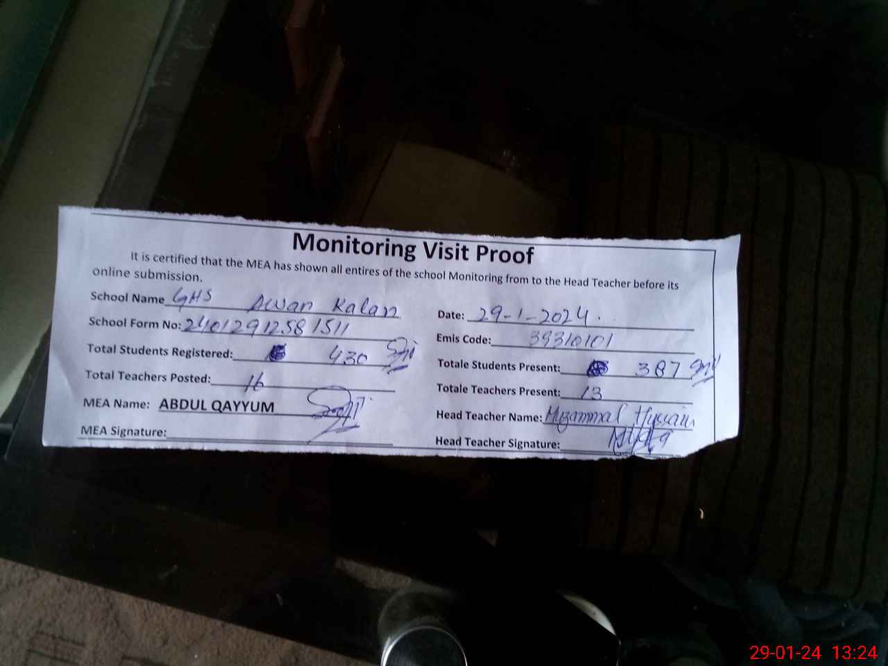 | Attendance Register | Head Teacher | MEA with School | Visit Proof |