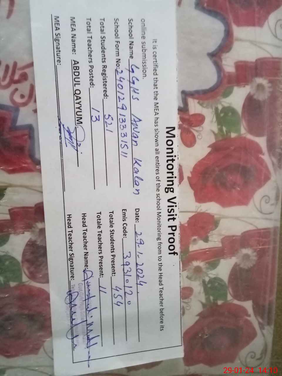 | Attendance Register | Head Teacher | MEA with School | Visit Proof |