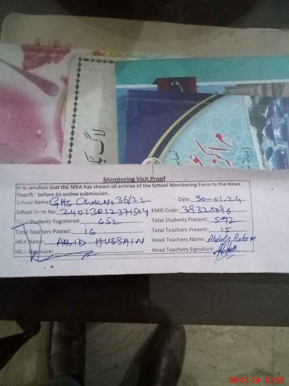 | Attendance Register | Head Teacher | MEA with School | Visit Proof |