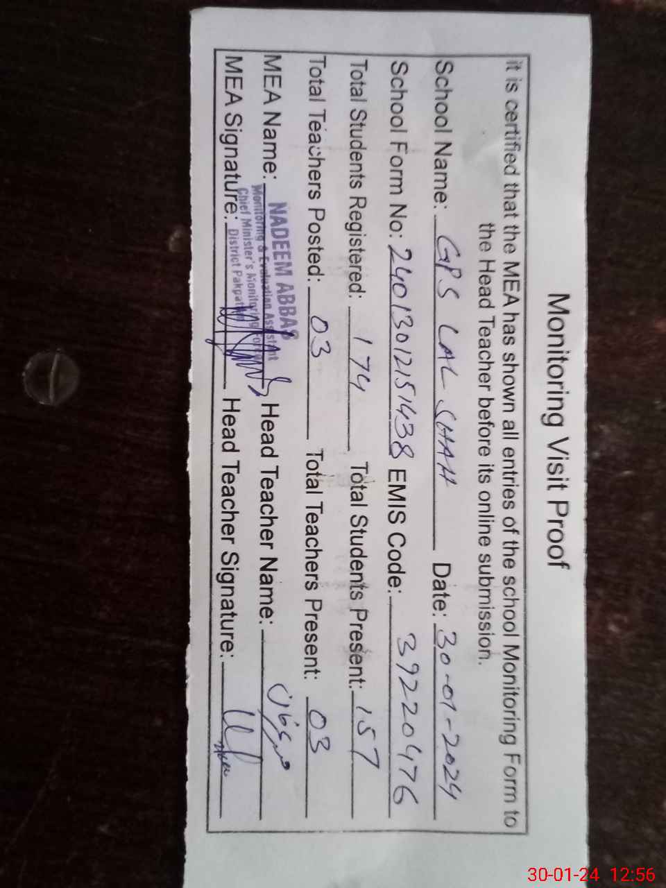 | Attendance Register | Head Teacher | MEA with School | Visit Proof |