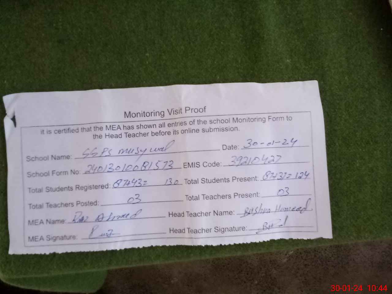 | Attendance Register | Head Teacher | MEA with School | Visit Proof |