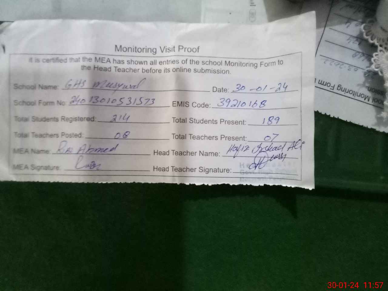 | Attendance Register | Head Teacher | MEA with School | Visit Proof |