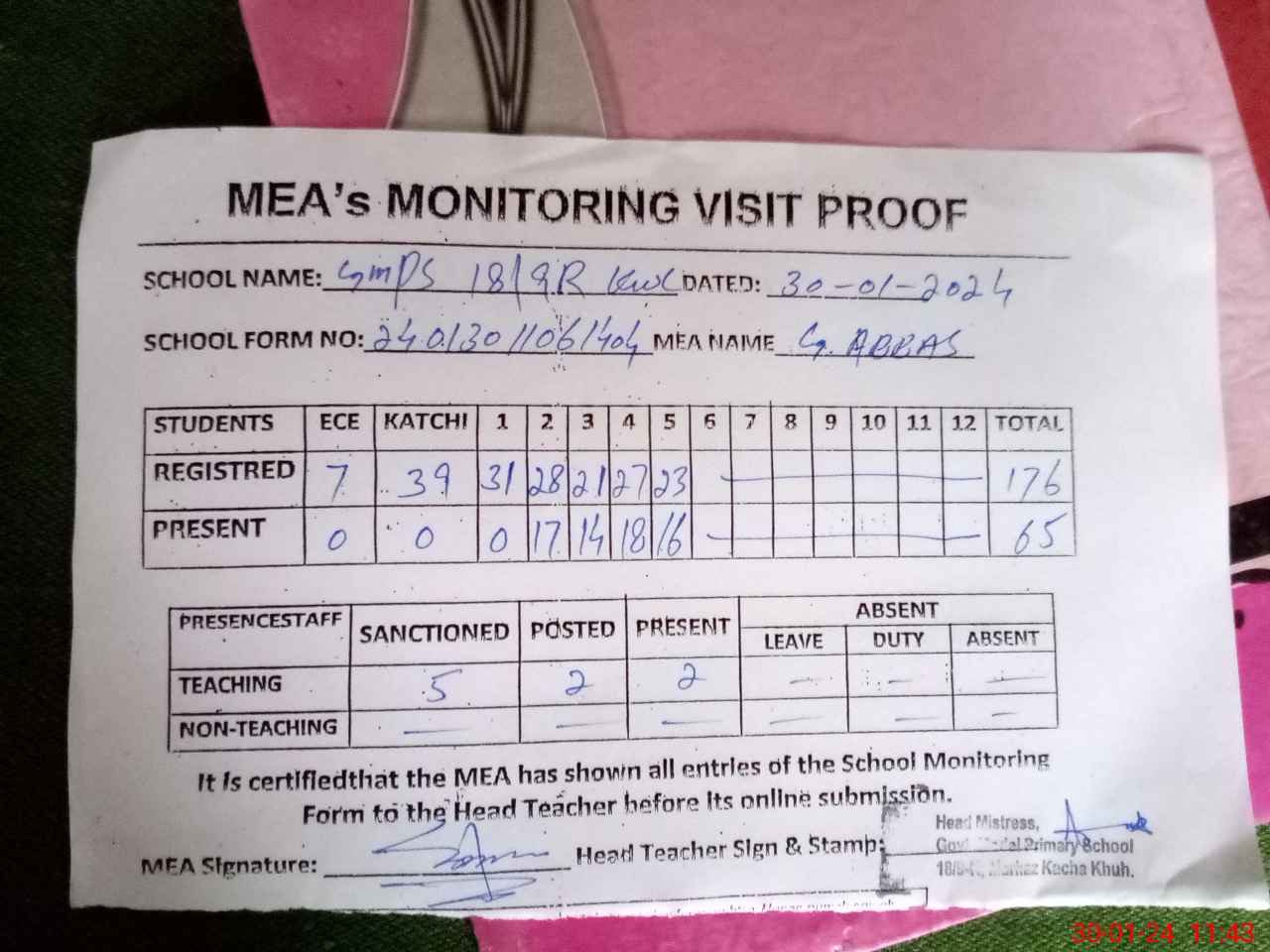 | Attendance Register | Head Teacher | MEA with School | Visit Proof |