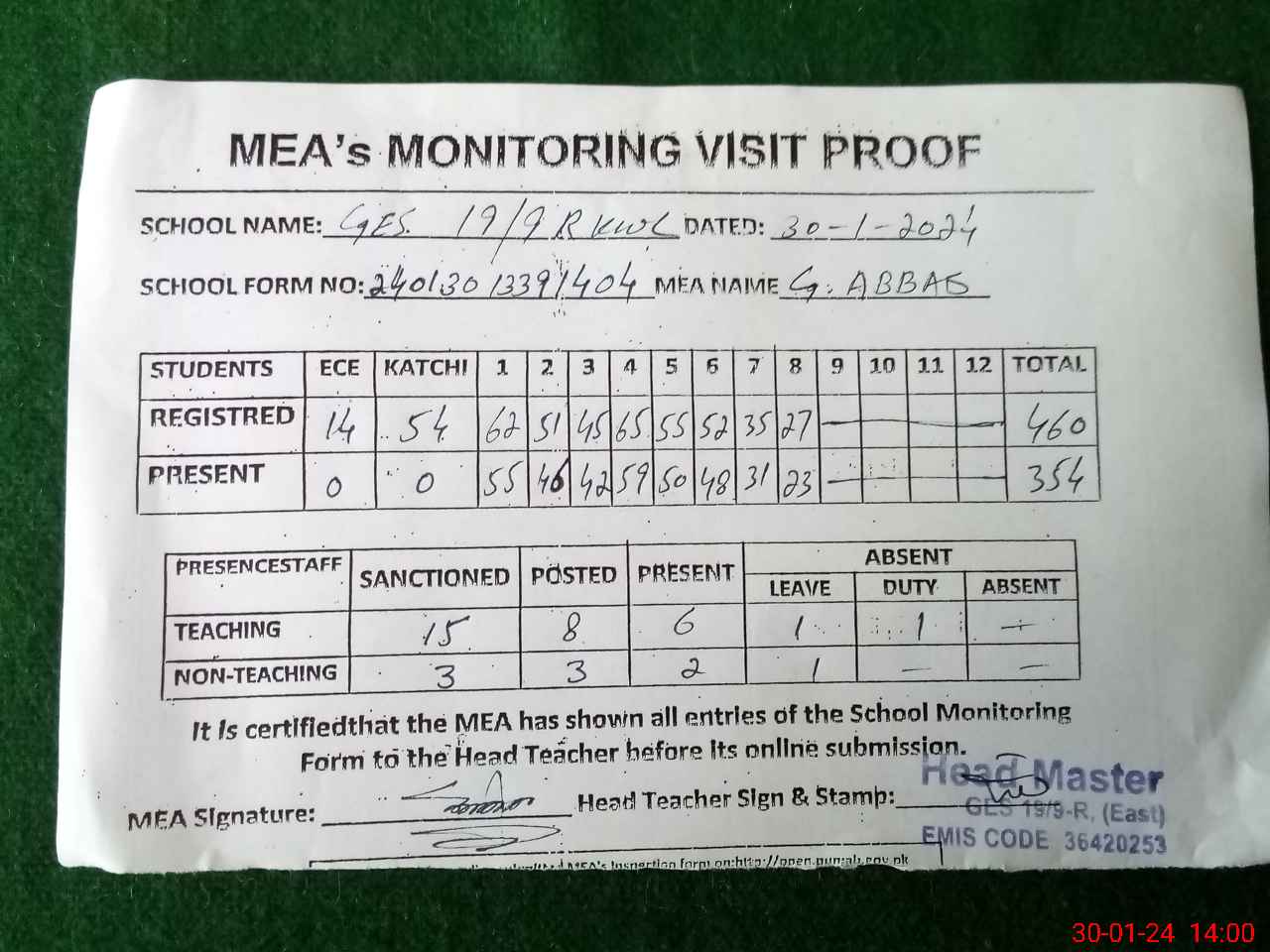 | Attendance Register | Head Teacher | MEA with School | Visit Proof |