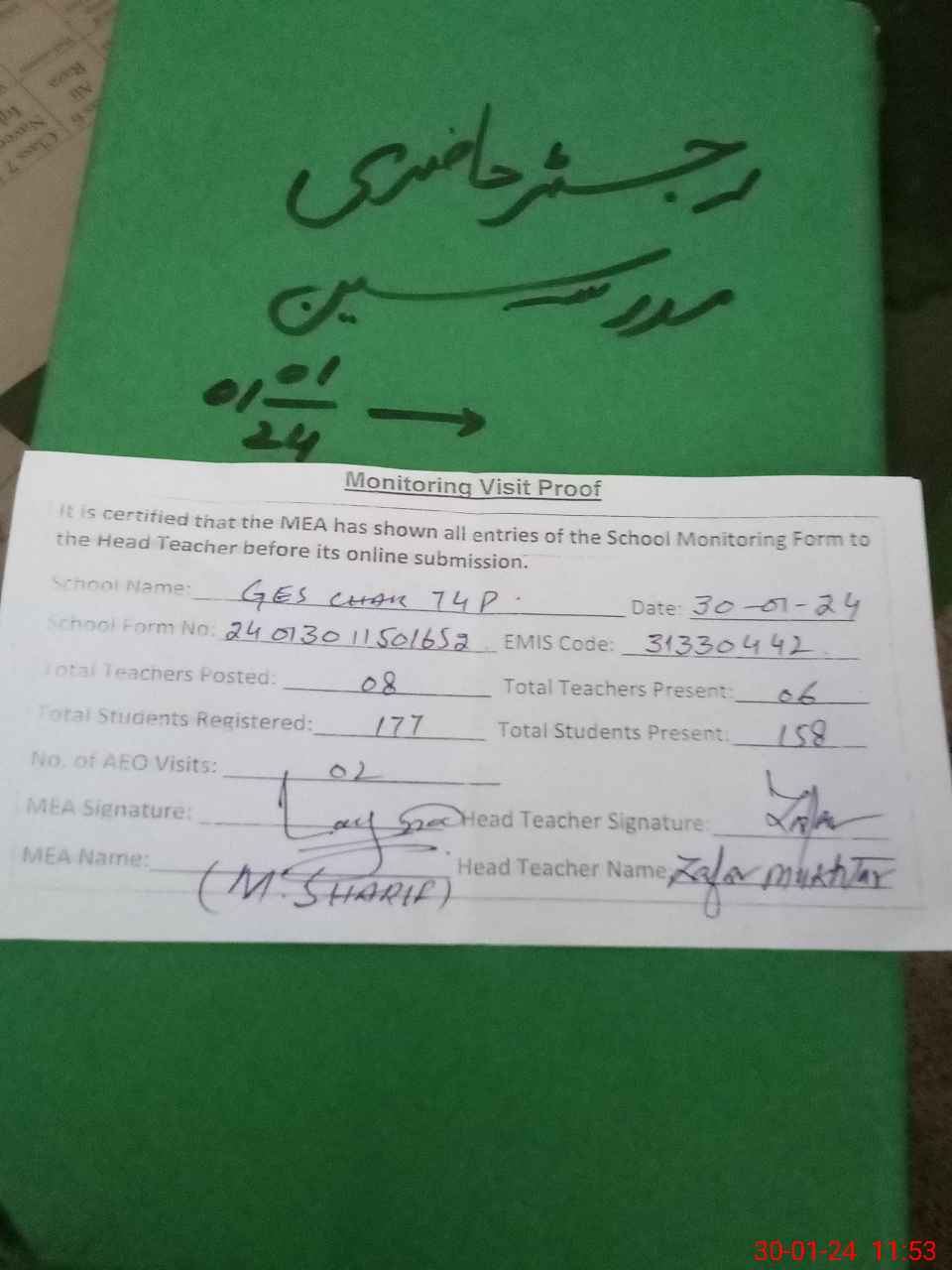 | Attendance Register | Head Teacher | MEA with School | Visit Proof |