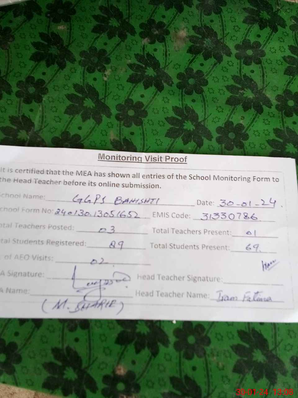 | Attendance Register | Head Teacher | MEA with School | Visit Proof |