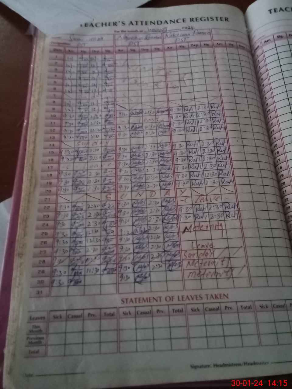 | 31**** | Ru**** Pe**** | 1 | 1 | 0 | 0 | 0 | 0 | 0 | 0 | 0 | 0 | 0 | Maternity |