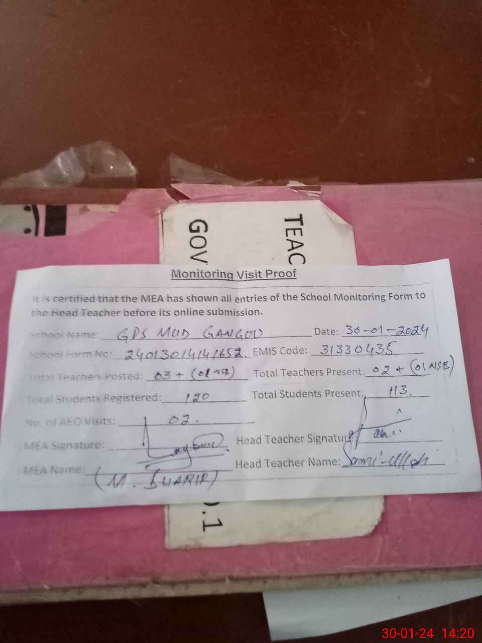 | Attendance Register | Head Teacher | MEA with School | Visit Proof |