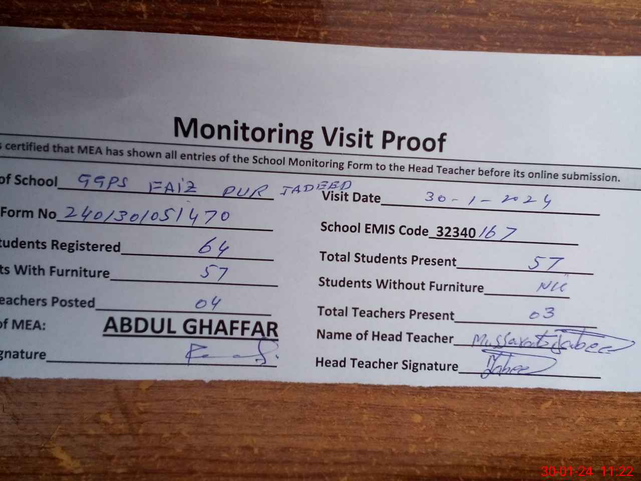 | Attendance Register | Head Teacher | MEA with School | Visit Proof |