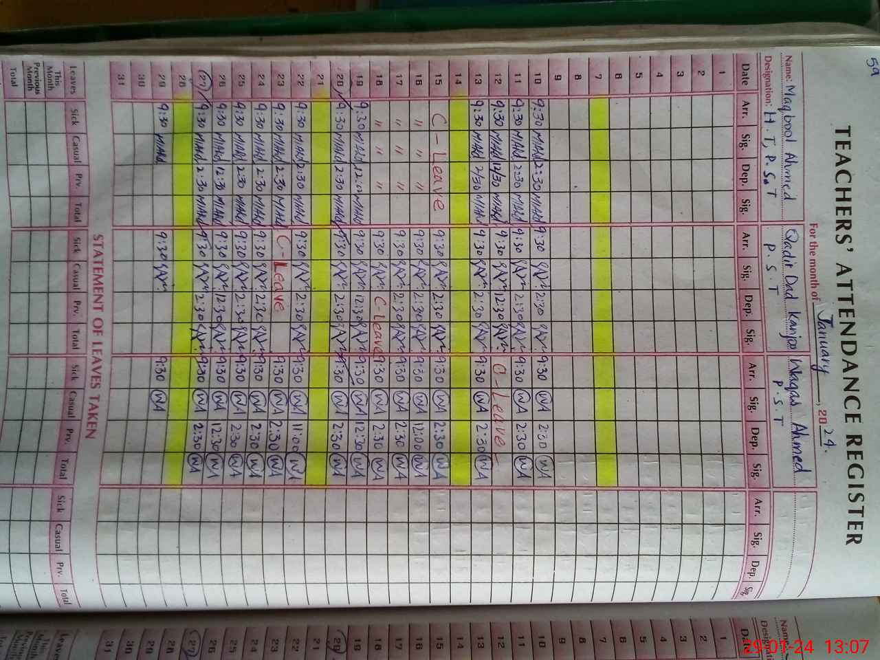 | CNIC | Full Name | Designation | R/C | Absence During Last Calender Month |