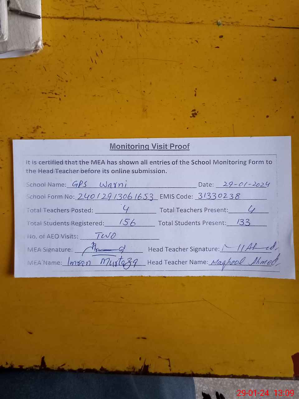 | Attendance Register | Head Teacher | MEA with School | Visit Proof |