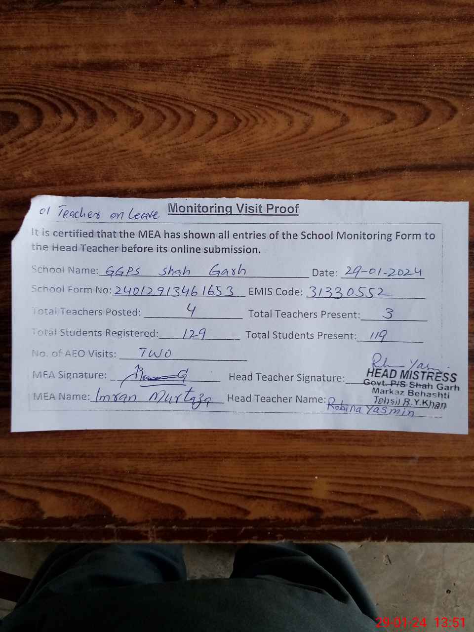 | Attendance Register | Head Teacher | MEA with School | Visit Proof |
