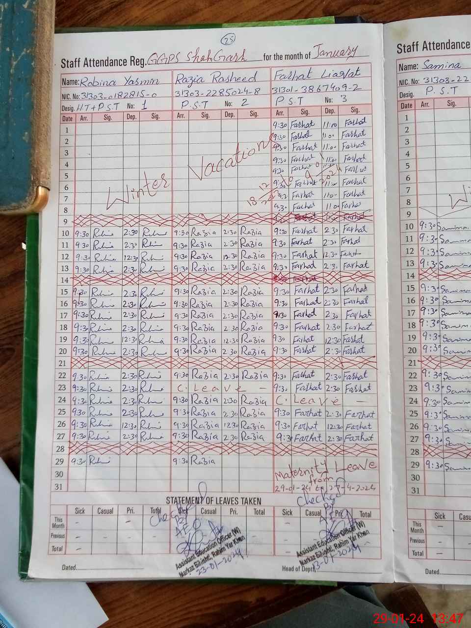 | CNIC | Full Name | Designation | R/C | Absence During Last Calender Month |