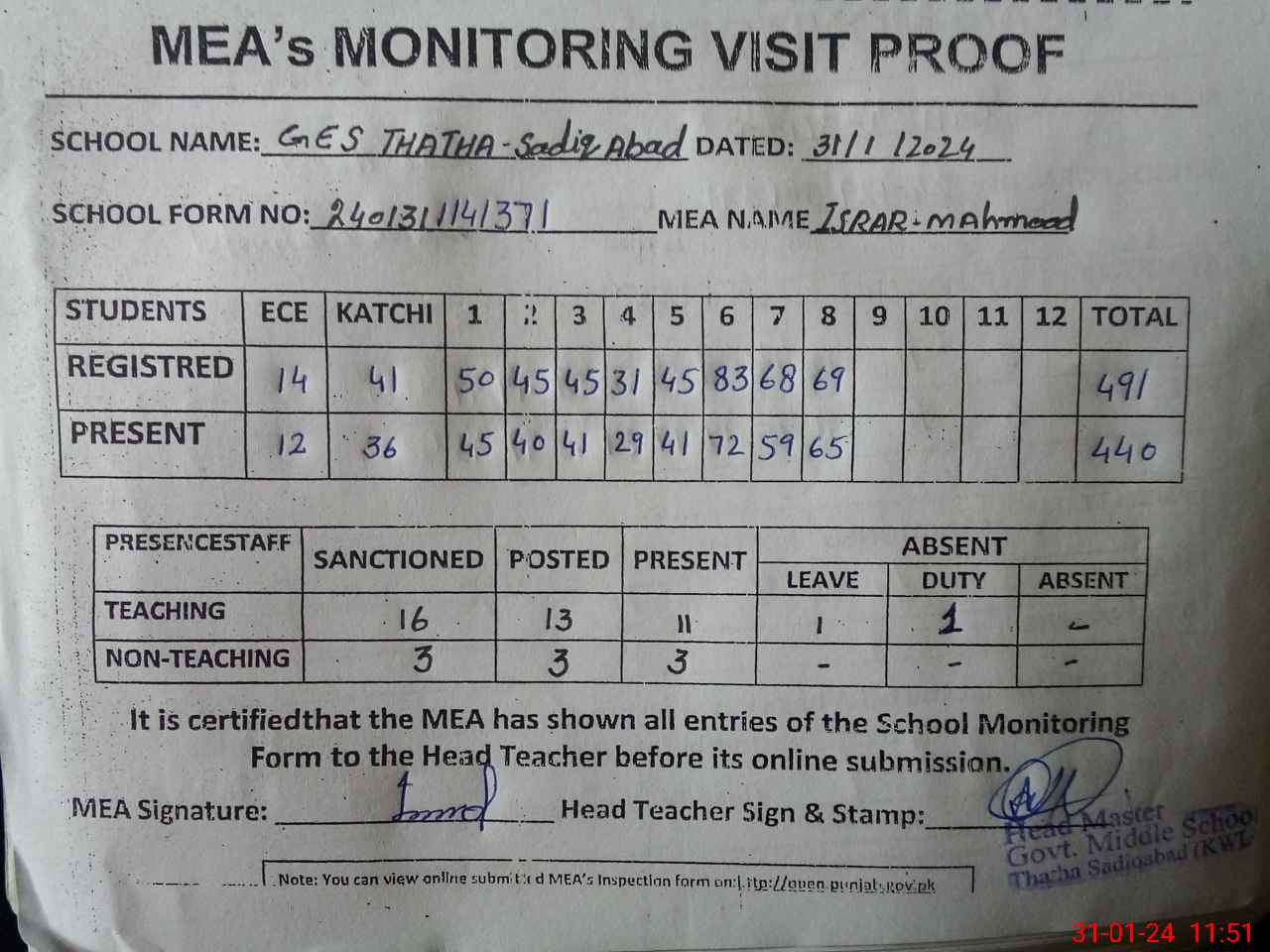 | Attendance Register | Head Teacher | MEA with School | Visit Proof |