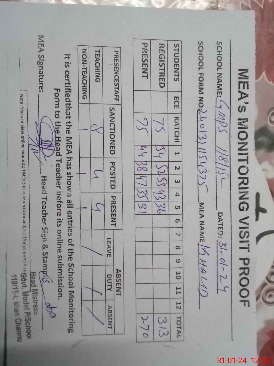| Attendance Register | Head Teacher | MEA with School | Visit Proof |