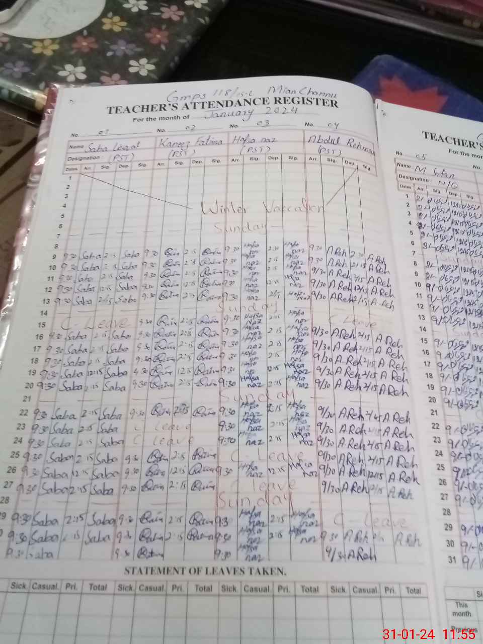 | Leave | Duty | Absent | Maternity | Medical | Ex- Pak |