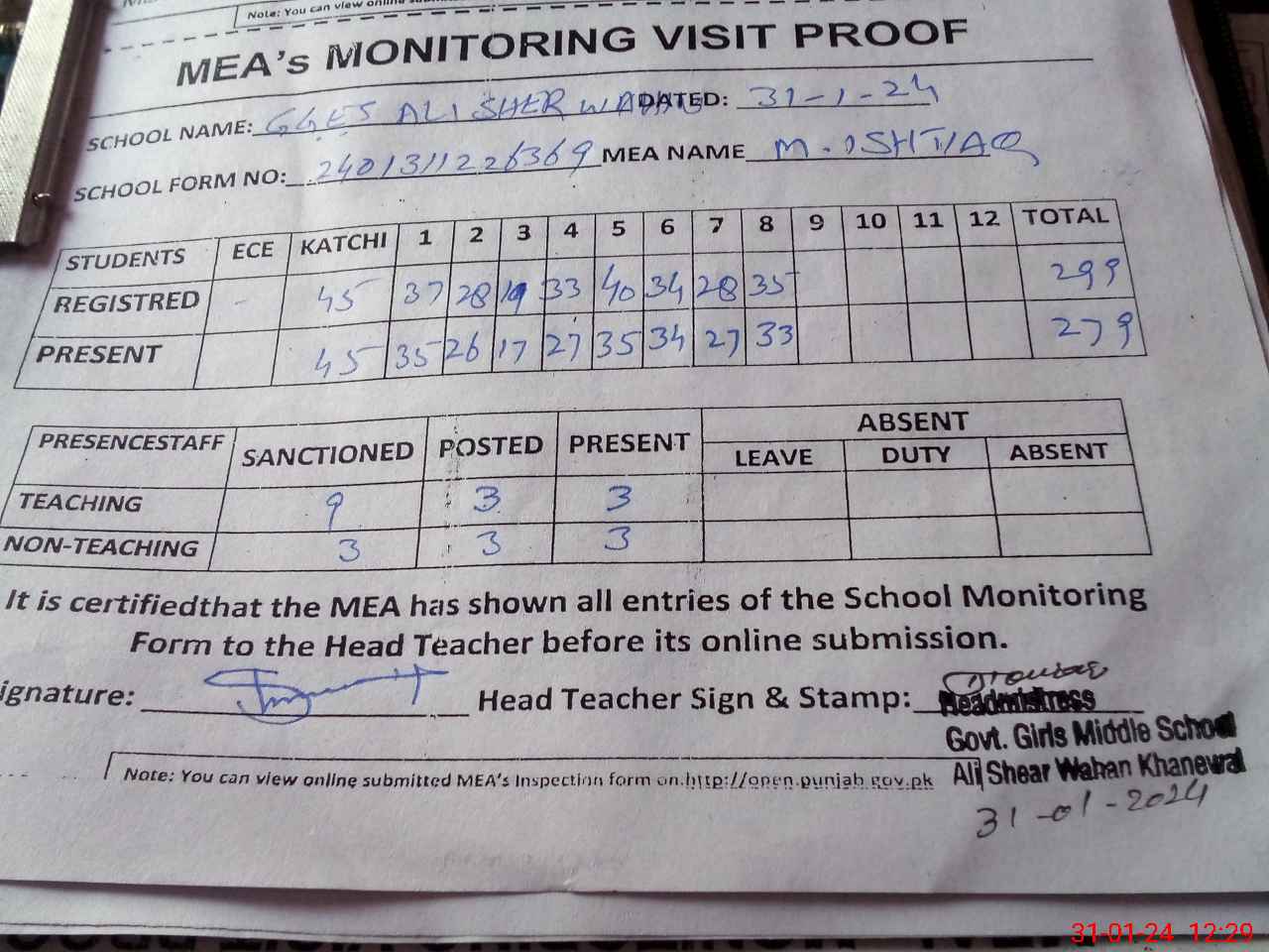 | Attendance Register | Head Teacher | MEA with School | Visit Proof |