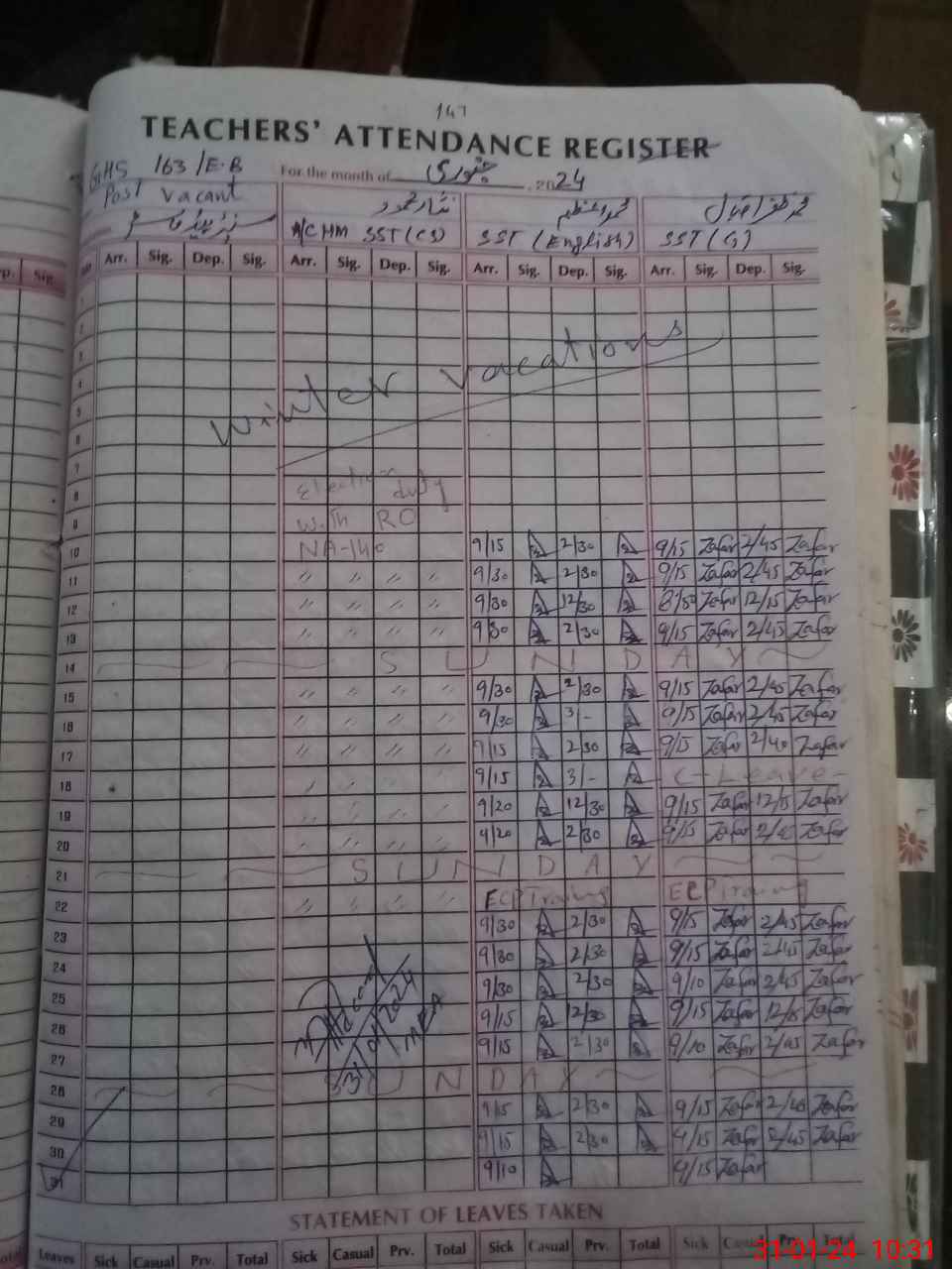 | Leave | Duty | Absent | Maternity | Medical | Ex- Pak |