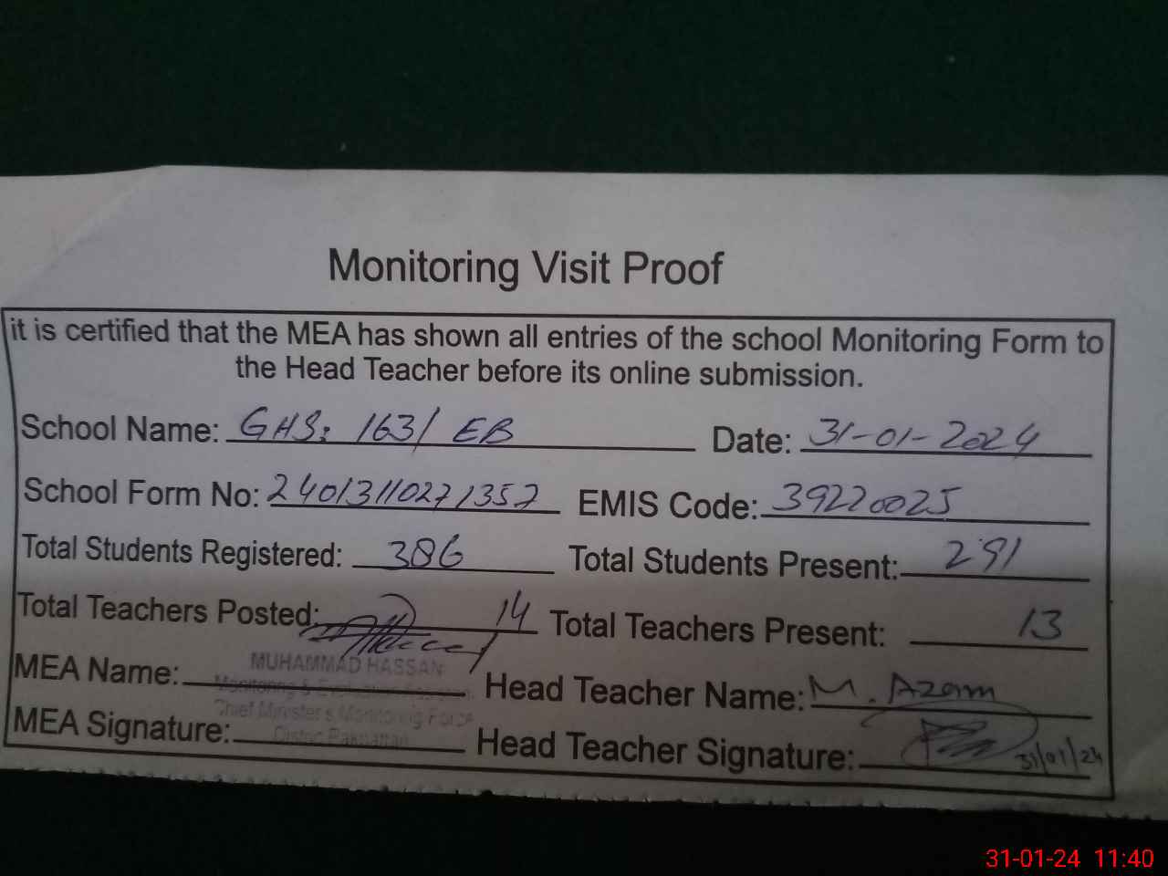 | Attendance Register | Head Teacher | MEA with School | Visit Proof |