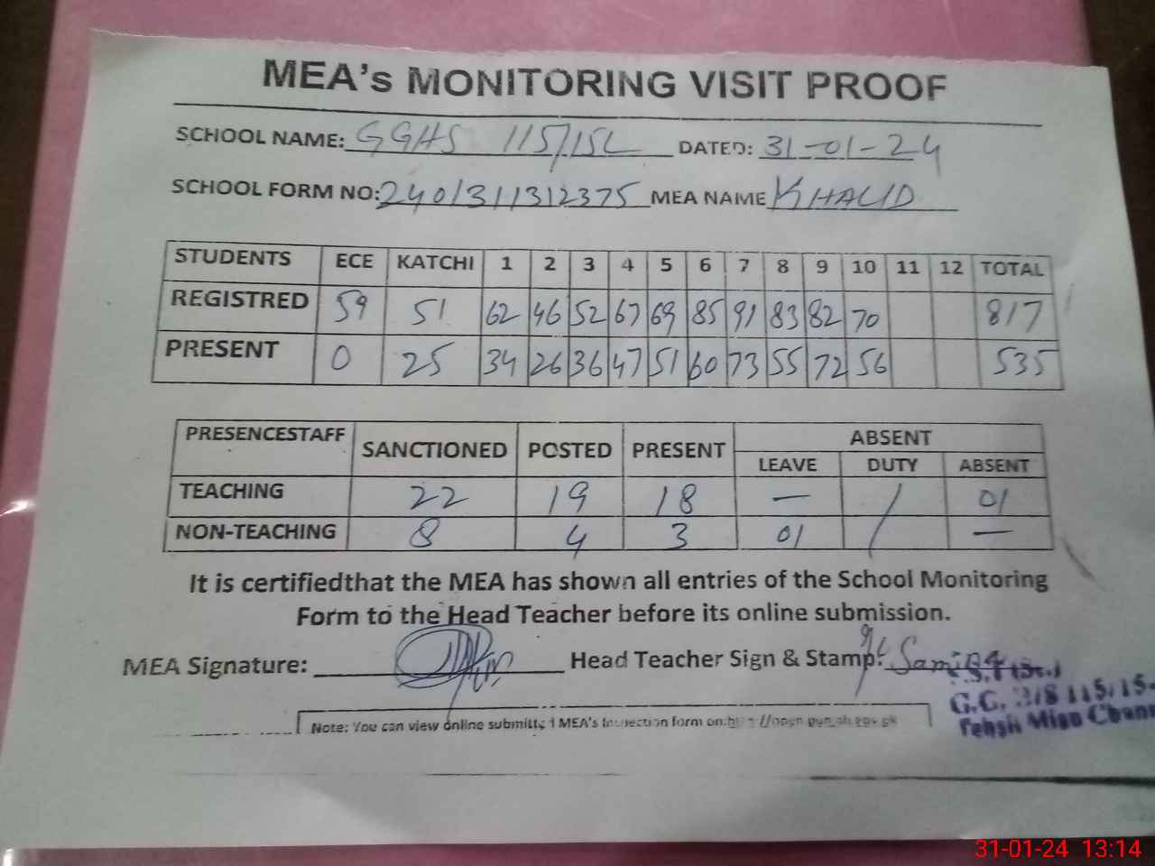 | Attendance Register | Head Teacher | MEA with School | Visit Proof |