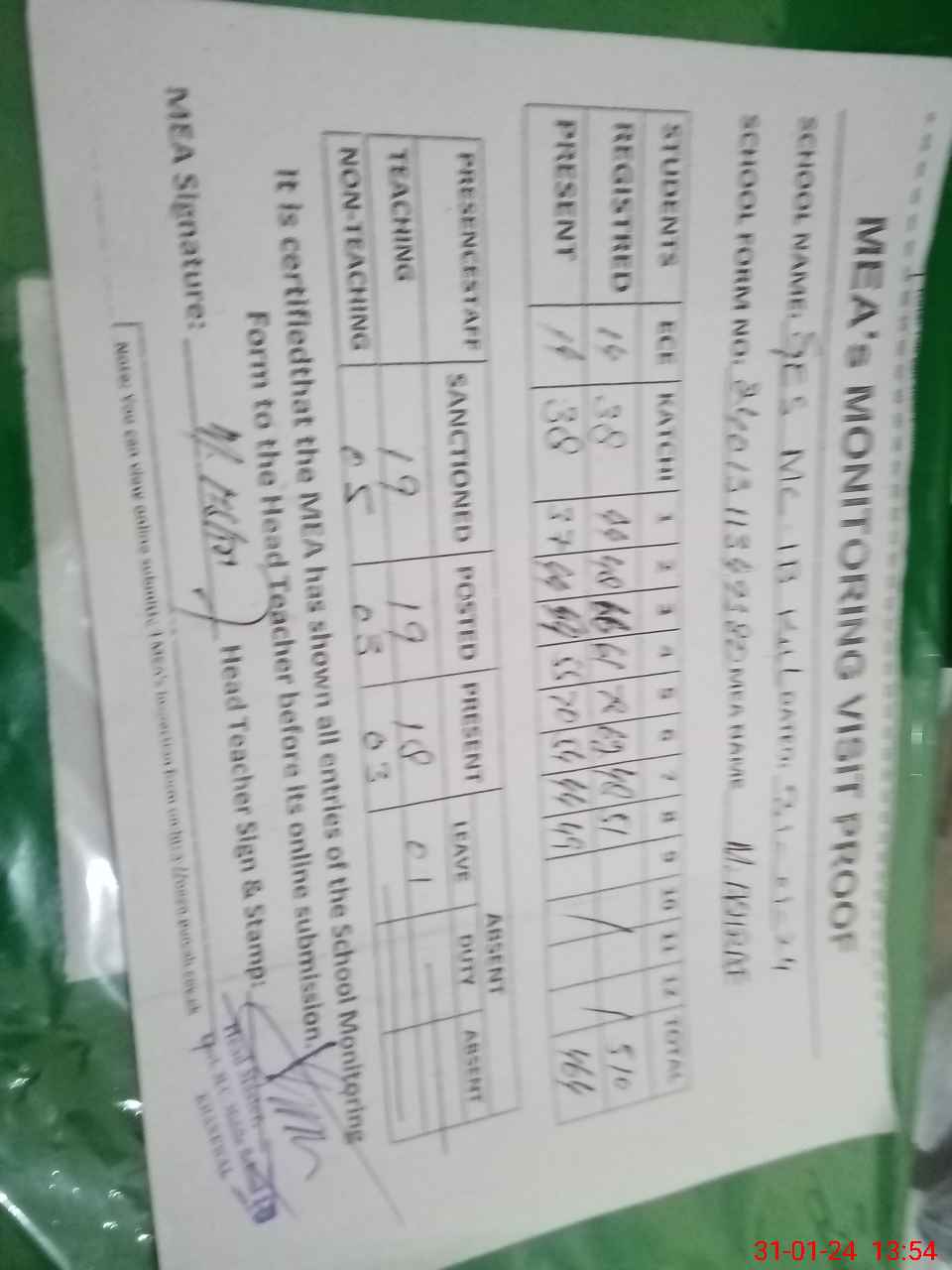 | Attendance Register | Head Teacher | MEA with School | Visit Proof |