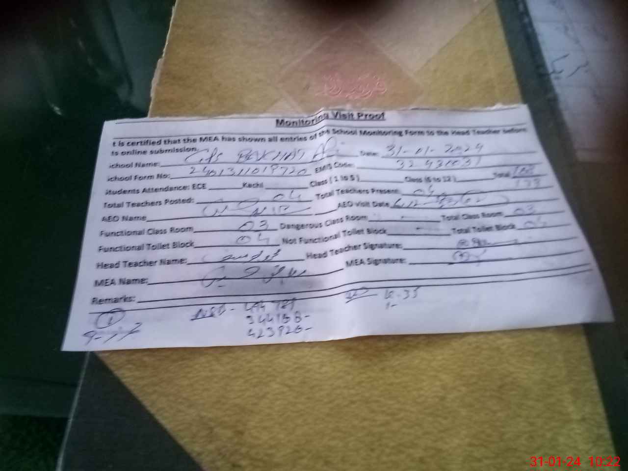 | Attendance Register | Head Teacher | MEA with School | Visit Proof |