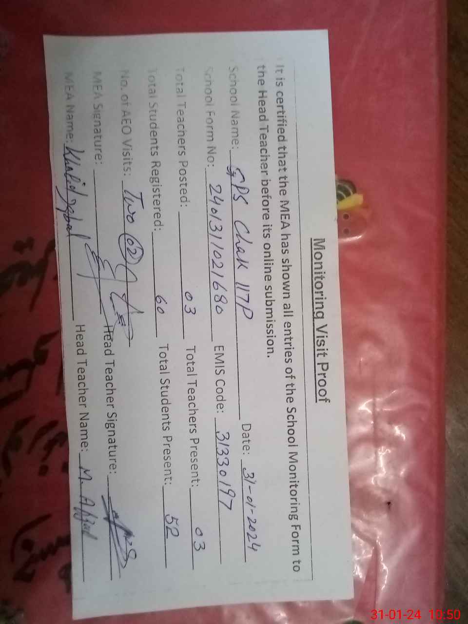 | Attendance Register | Head Teacher | MEA with School | Visit Proof |