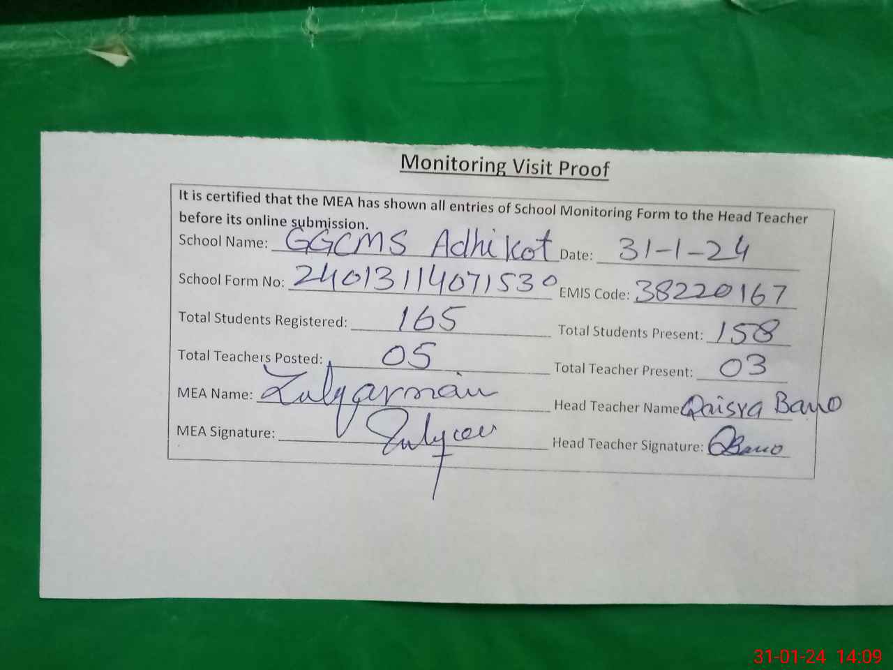 | Attendance Register | Head Teacher | MEA with School | Visit Proof |