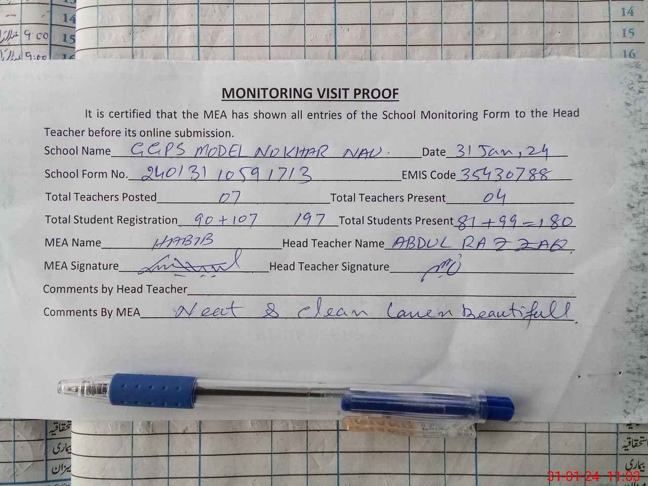 | Attendance Register | Head Teacher | MEA with School | Visit Proof |