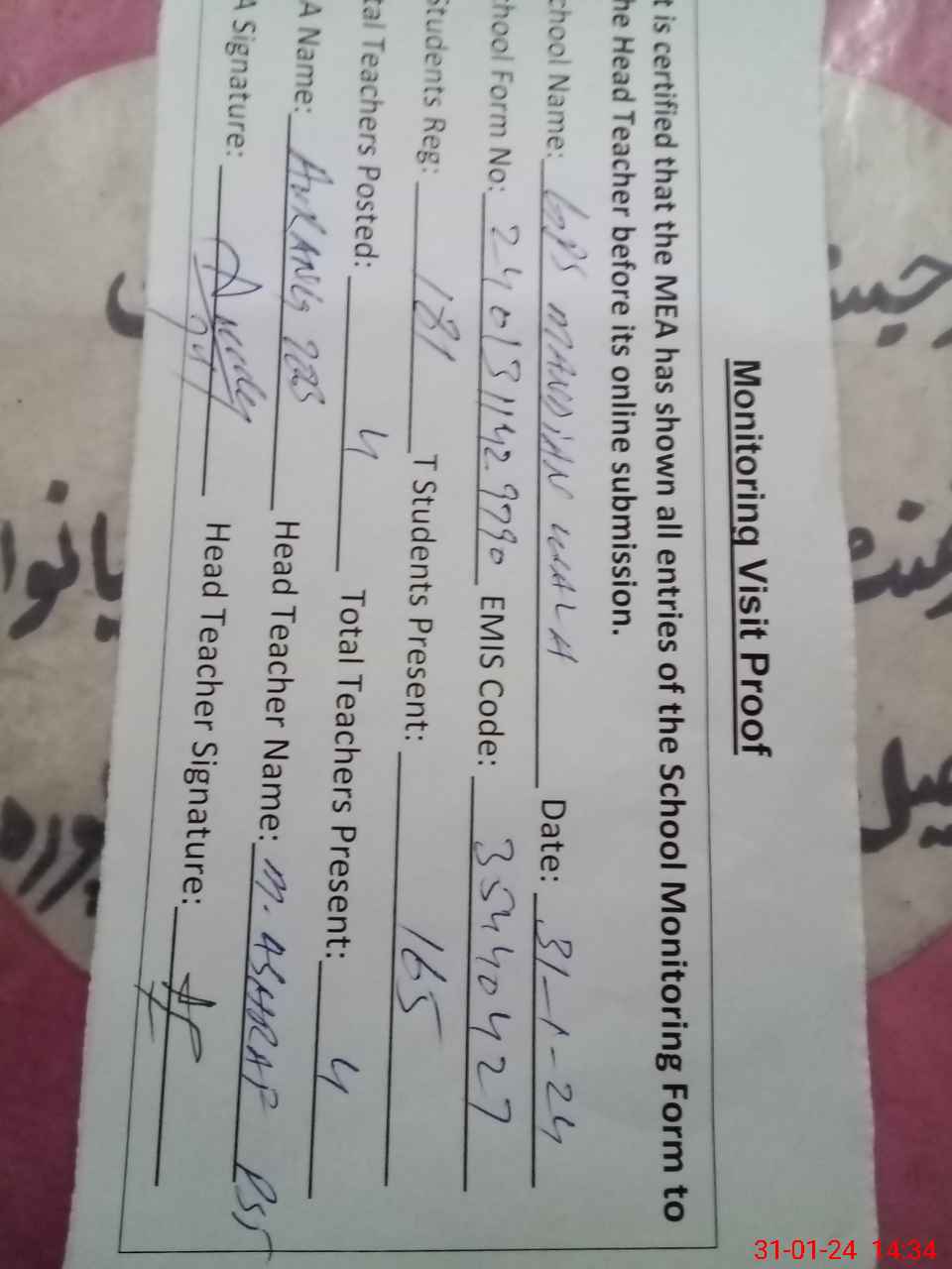 | Attendance Register | Head Teacher | MEA with School | Visit Proof |