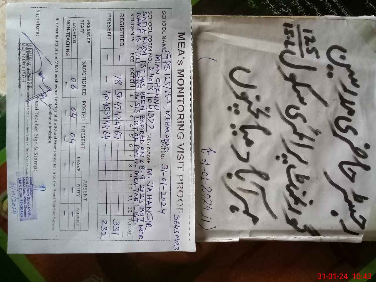| Name: MU**** Sh**** Designation: (School Headmaster's/Headmistress's) PST Phone/Cell Number: 03**** |